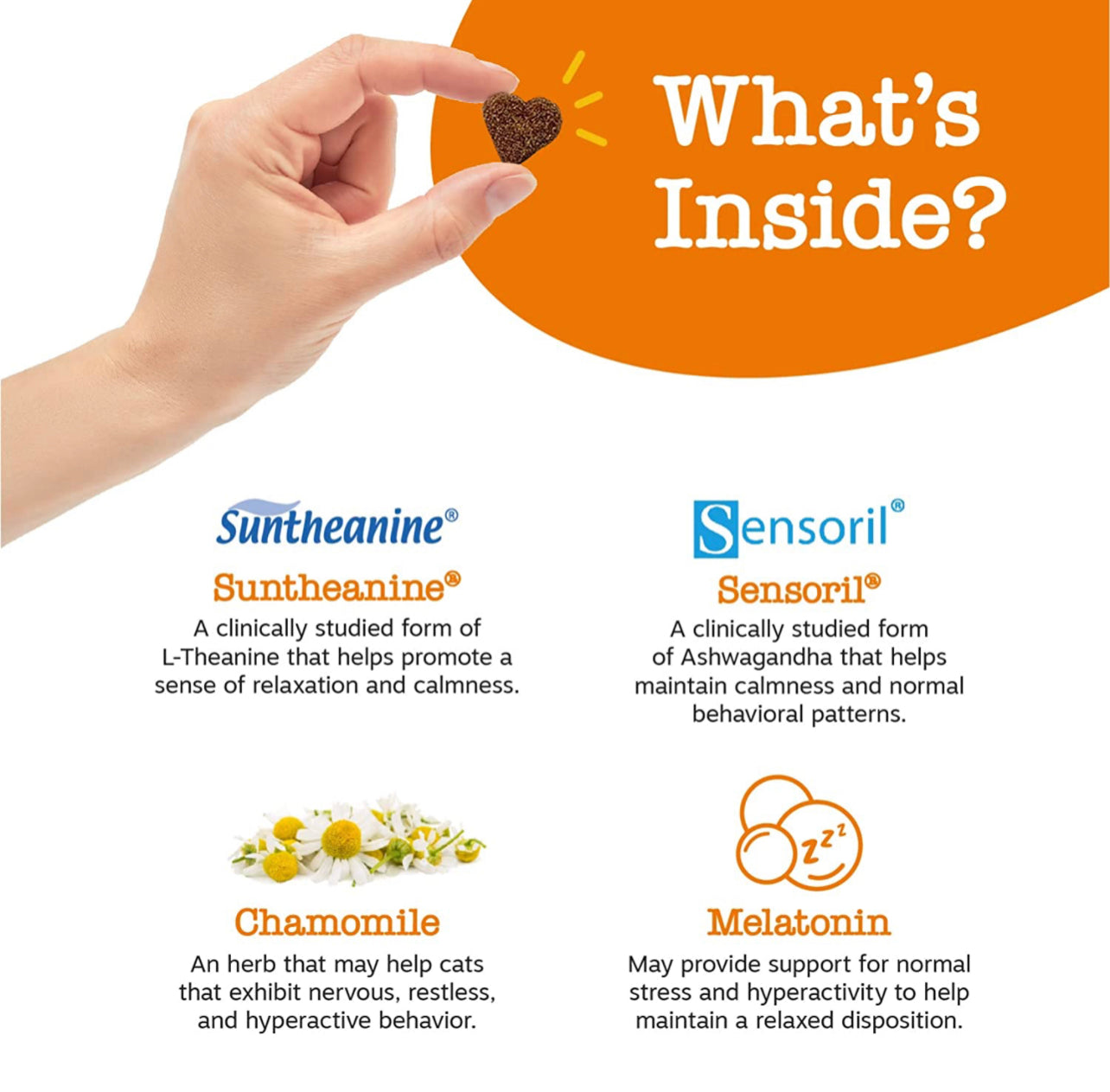 -Este suplemento funcional para perros contiene Suntheanine, una forma avanzada de L-Theanine para apoyar la relajación y la calma de su mascota felina.