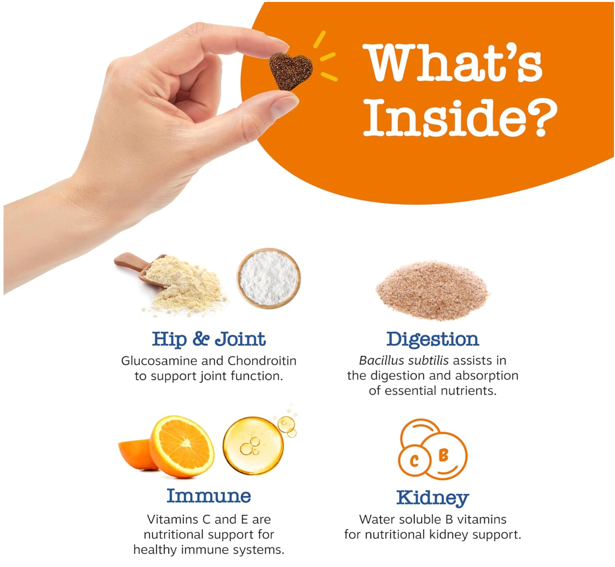 Caderas y articulaciones: glucosamina y condroitina para brindar apoyo nutricional para la fuerza de las articulaciones, la salud de los huesos, el soporte del tejido conectivo y la flexibilidad.